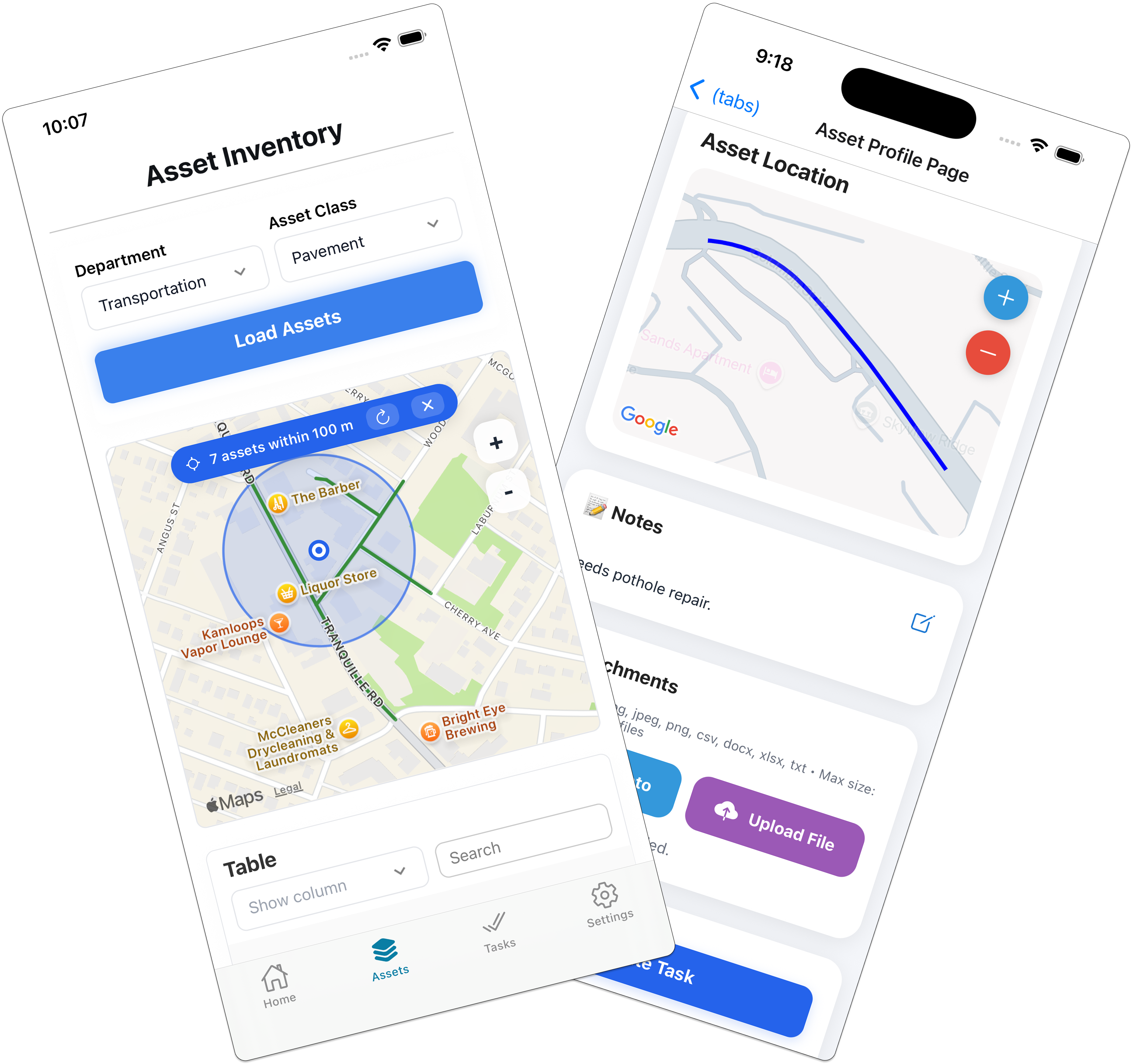 A dedicated mobile app for Android and iOS that supports inspections, condition updates, photo capture, offline functionality, GPS tracking, and work order management. Field updates sync directly to the central platform to maintain real-time asset information.